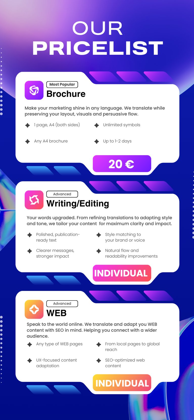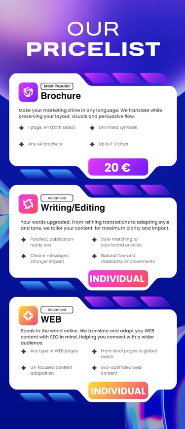 We craft persuasive, market-adapted content designed to engage, differentiate, and drive results. Our service goes beyond basic copywriting — covering websites, brochures, flyers, and more — tailored to your audience’s culture, mindset, and language.